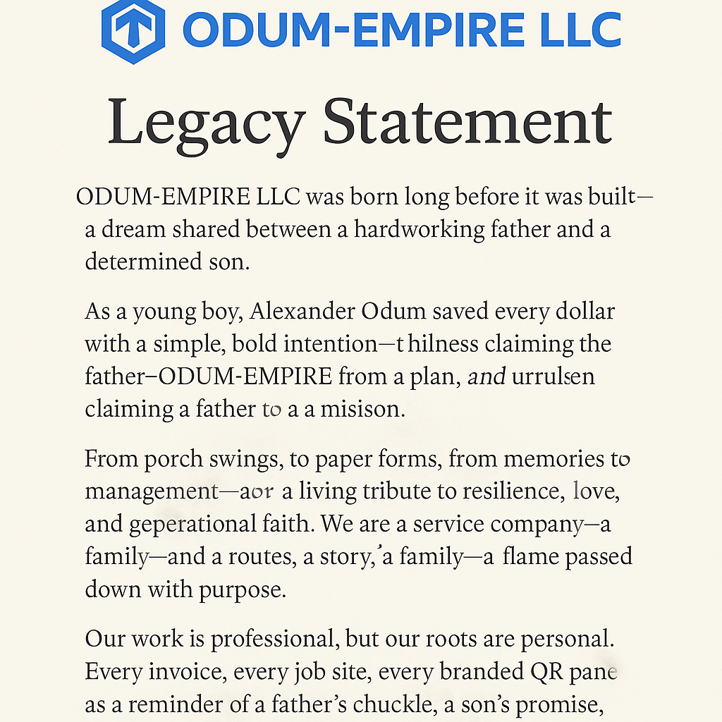 ODUM-EMPIRE LLC was a father and son dream that never had a chance to come alive. In the early 2000’s, I lost my dad to liver failure and had to put this dream to sleep. I would work with my dad on the weekends and all summer long when school let out for break. My dad used to ask me what I was going to do with all my saved money, and I’d tell him, “I’m going to buy him and me our own company when I have enough”. He would just smile and walk away. One day when I was about 11 or 12 years old, my dad asked me out of the blue, ” If you ever buy us a company, what are you going to call it?”. I thought about it for almost a whole year before I finally gave him an answer. It was almost winter of the following year when I found my dad sitting on the porch swing with his coat zipped up and his winter hat on, he hadn’t been able to work for several weeks, and we were out of money. The bills had already piled up on my parents and I could feel my dad’s heart breaking in the words that he spoke. Before I had went out to find him, I went to my secret spot in my room and got my jar of saved up money. I already knew it was time to invest in the company that we already had right here at home as a family. I sat down next to my dad on the swing and propped my head against his shoulder and said “ODUM-EMPIRE”, and my dad started to softly chuckle, and repeated it back to me as if asking was I sure… I sat up and handed him my jar of money and told him it was the first investment payment towards our company…. I am a grown man now and have my own children now, they are grown as well. I still sometimes go out on the porch and sit next to the memories of my dad and the encouragement towards building our own company, which brings me here with you today with a humble heart I gladly welcome you to be a part of ODUM-EMPIRE LLC. we are pleased to be of service for your unique needs because this is “Where Quality Meets Experience”
